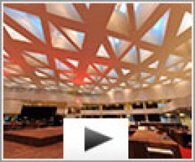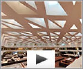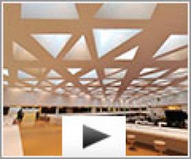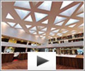 Grâce au plafond spectaculaire, le hall central est lumineux, spacieux, et confortable. 4500 m² de plafond tendu Barrisol acoustique ont été installés pour améliorer le confort sonore.