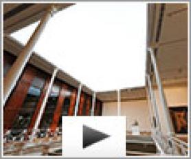 Le plafond Barrisol Lumière, qui surplombe une enfilade de colonnes en fer, participe au mélange habile des styles industriel et contemporain.
