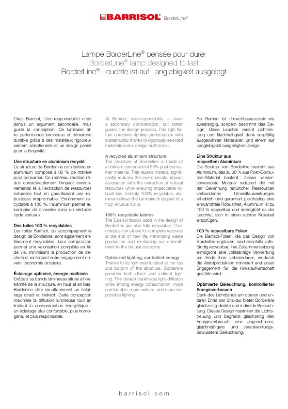 BorderLine® is a luminaire designed to provide continuous peripheral lighting, available in round or square versions. Its dual light emission — direct and indirect — creates a subtle balance, ideal for structuring a space while enhancing its volumes. It combines aesthetics, acoustic performance and visual comfort, and fits into all environments: offices, hotels, retail or cultural spaces. Eco-designed, 100% recyclable, with reusable LEDs.