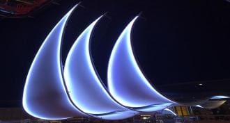 These are three monumental light fixtures, of 12m96, 11m56 and 7m85, in the shape of sails that have been installed inside the Italian cruise ship, Costa Fortuna.
