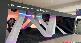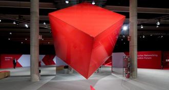 Barrisol® Poppy Red (ref. 02083) lacquer-finish fabric and Barrisol Mirror® Silver (ref. BHMS 1) fabric installed for the Cisco Live! 2019 trade show in Barcelona. An immense red cube balanced on one of its tips with the Barrisol® mirror illusion.