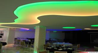 PH Proyectos designers have created an interior design for the Multi-Room "Senses" in Hotel H10 Playa Americas in Tenerife. Organic shapes cut out of a plasterboard ceiling: a major challenge for Barrisol® teams.