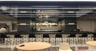 In the premises of an American start-up, specialized in the sale of second-hand cars online, a Barrisol Mirror® Silver ceiling magnifies the bar in the relaxation area.