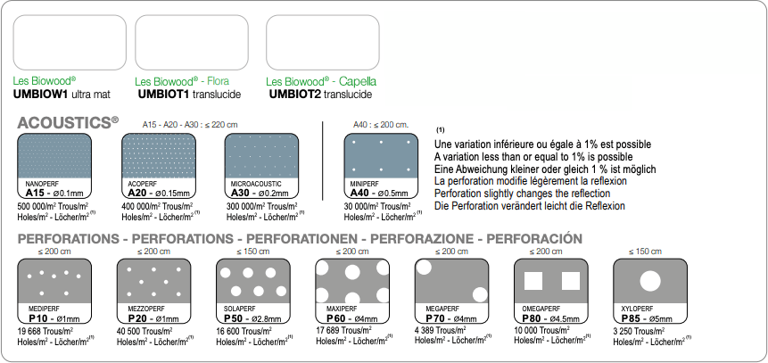 Das Sortiment Die Biowood® ist in matt und transluzent erhältlich, behält alle Eigenschaften der Barrisol-Decke bei, um das Beste aus Akustik, Licht und natürlich der Klimatisierung zu bieten. Biowood ist ideal für alle Ihre Bau- oder Renovierungsprojekte, um die Dekarbonisierung Ihrer Gebäude erfolgreich durchzuführen.