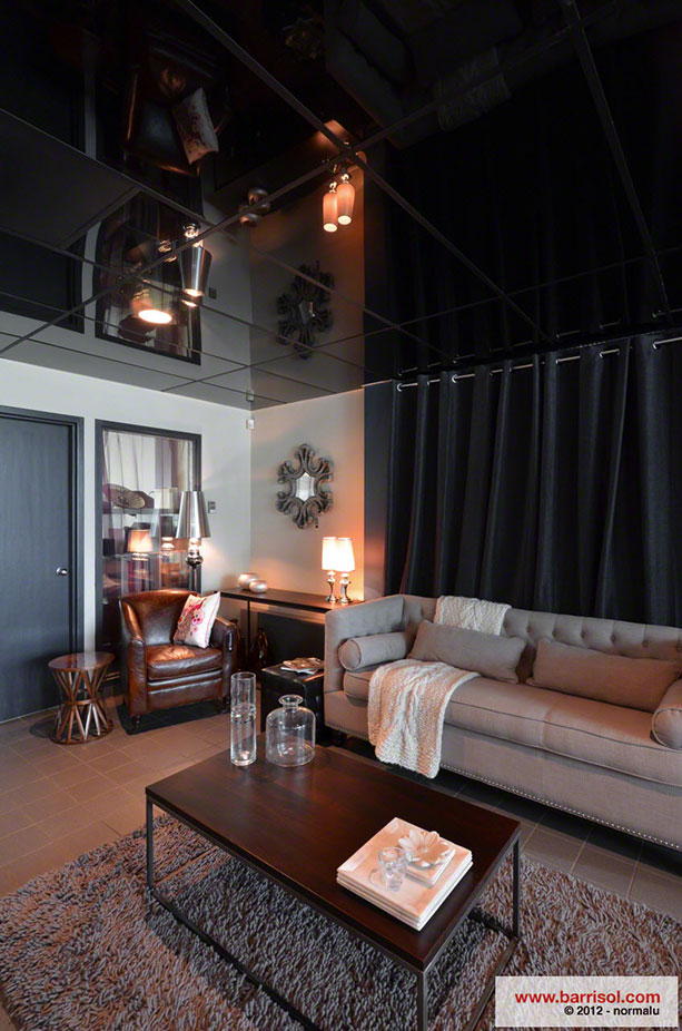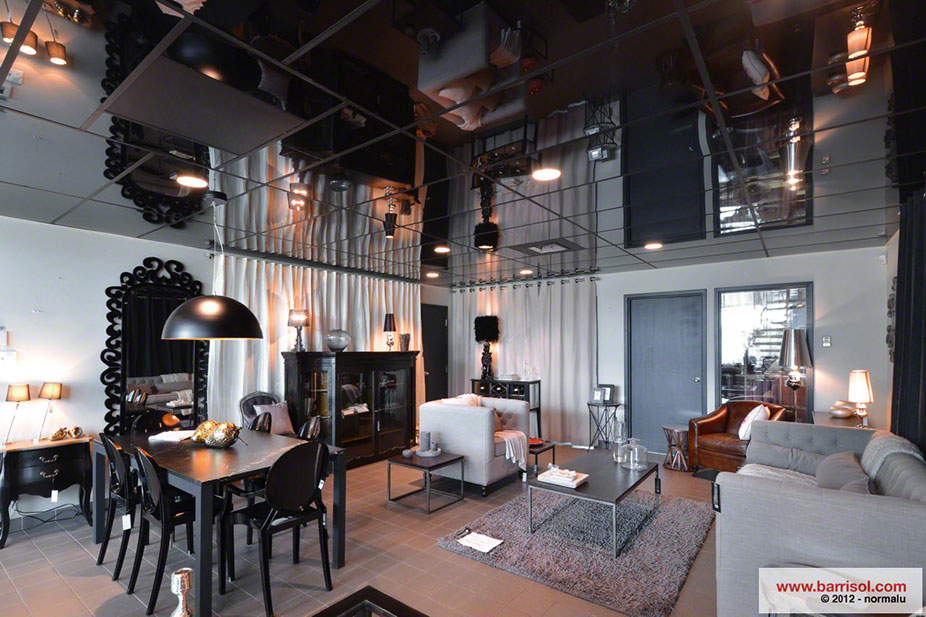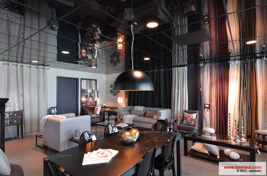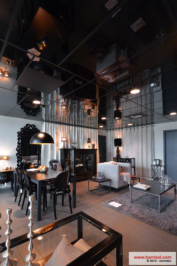 In the showroom of this nice boutique you will find a new concept, developed and invented in Canada, which is cladding old rigid acoustic tiles with Barrisol products.