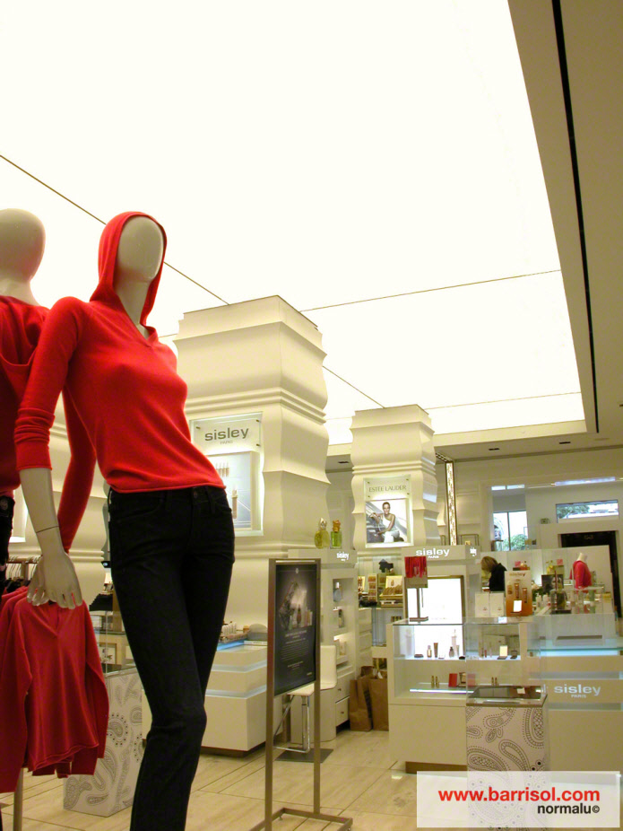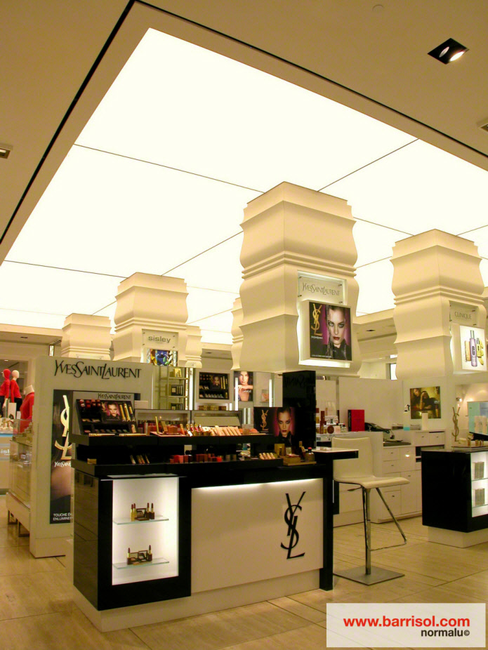 The primary use of Barrisol in these high end boutiques (Montreal, Calgary…) are for the lighting the translucent membrane offers. What better way to make sure new items stand out… the addition of creative lighting. The Holt Renfrew Boutiques have used the double membrane Stretch Ceiling Lighting application to avoid the accumulation of dust and dirt.