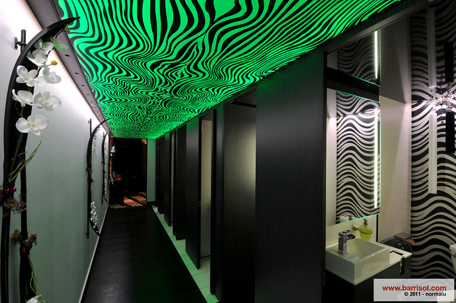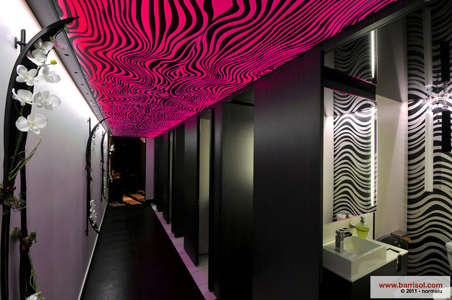 Dans l’aire principale du restaurant, un plafond tendu translucide Barrisol a été installé avec des formes poussées aux extrémités des sorties de lumières et à différents niveaux d’élévation.