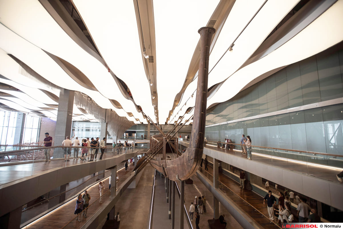 Situé à proximité du Grand Egyptian Museum, le bâtiment du Solar Boat accueille près de 3 000 m² de vagues en Barrisol Lumière Acoustique® 3D.